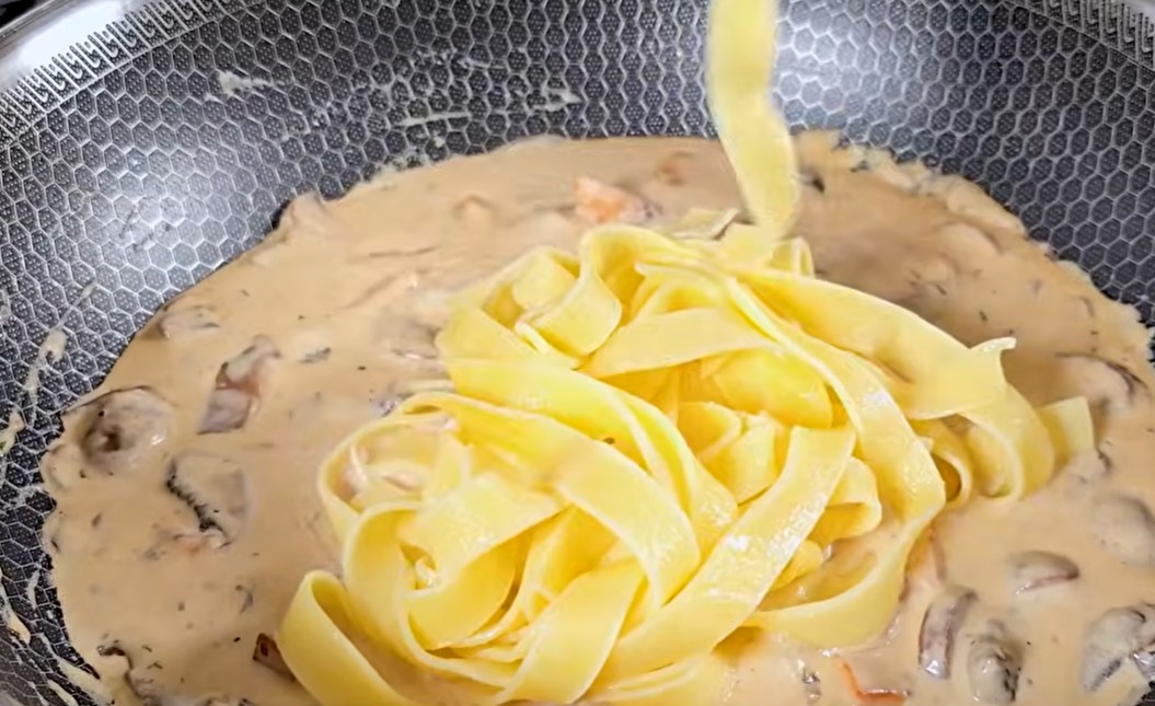 2) Následně si osmahneme houby a přidáme smetanu. Chvilku povaříme a přidáme najemno nakrájený česnek.