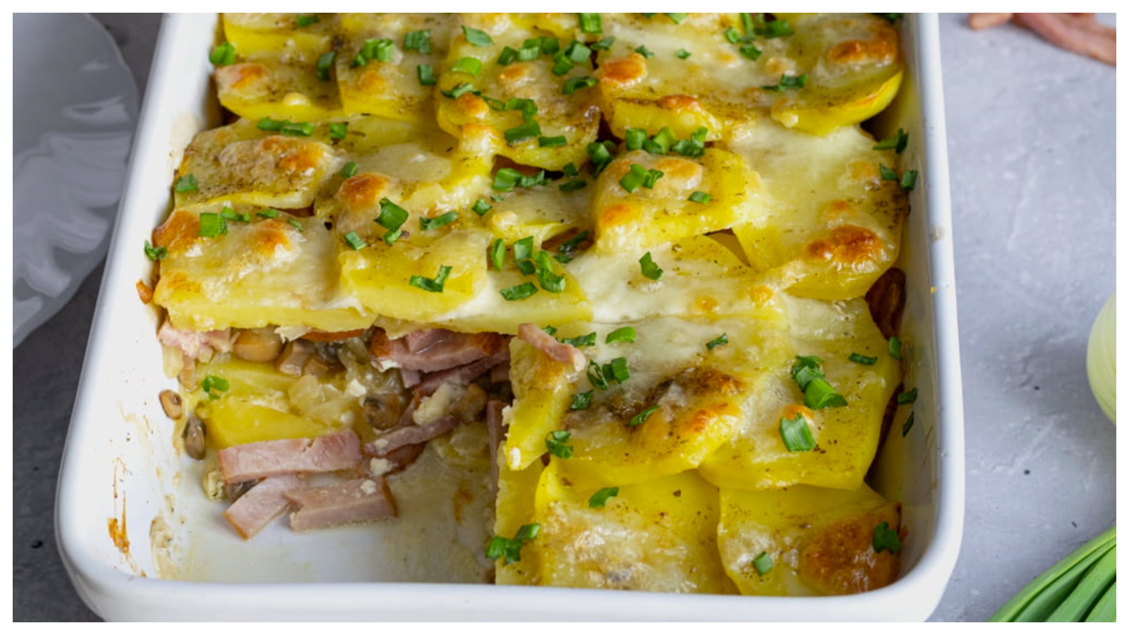 Šťavnatá krkovice dušená se slaninou, cibulí a houbami, doplněná o jemné brambory s jarní cibulkou. Skvělé jídlo, které opravdu zasytí a zahřeje.