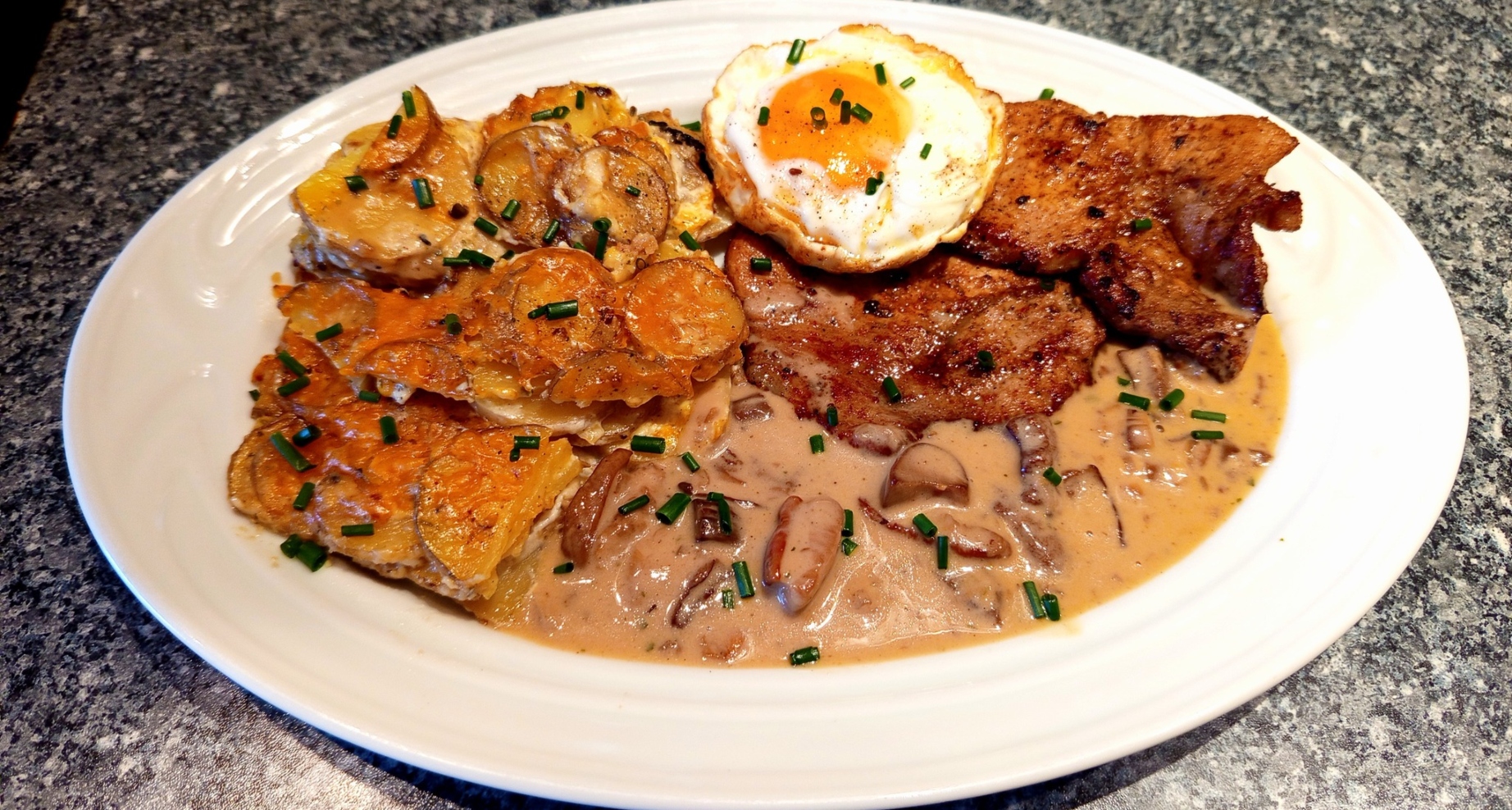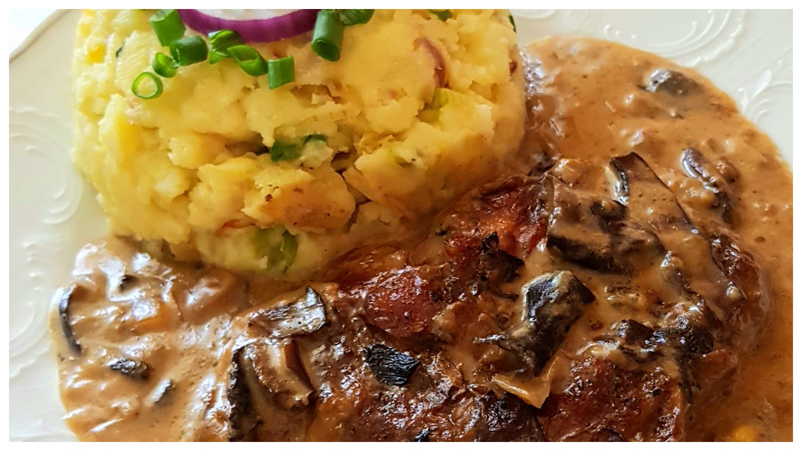 Klasická kombinace masa, hub a smetanové omáčky – jemné maso a výrazná omáčka potěší všechny milovníky tradiční kuchyně.