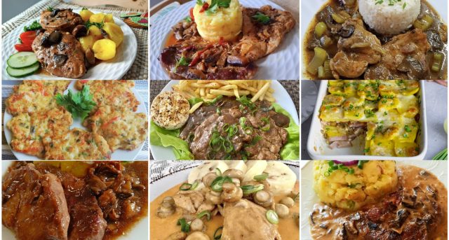 9. Pečené krůtí a vepřové plátky s ajvarem a houbami (se šťouchanými bramborami)