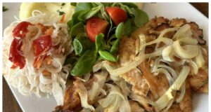 Objevte recept na vepřové plátky zapečené s cibulí a podávané s brambory s pažitkou a svěžím rajčatovým salátem. Ideální pokrm pro letní stolování.