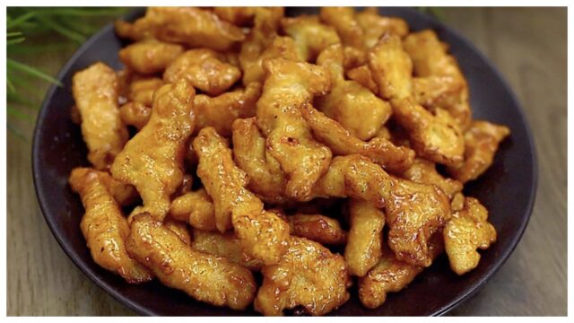 2) Smažení kuřecího masa: Na pánvi rozehřejte dostatek oleje. Kuřecí kousky smažte do zlatova a dokud nejsou úplně propečené. Poté je vyjměte a odložte na stranu.