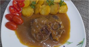 Vepřové plátky s krémovou cibulovou omáčkou a opékanými brambory