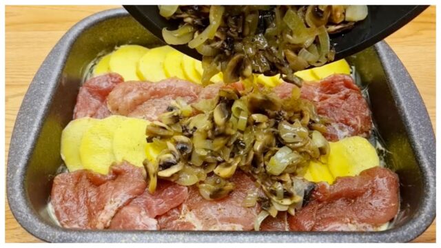 4) Vrstvení: Do vymazaného pekáče vrstvěte brambory, maso a opět brambory. Na vrch rozložte směs žampionů s cibulí.