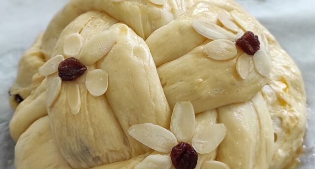 Vykynuté bochánky potřete rozšlehaným vejcem a bohatě posypejte mandlemi. Ostrým nožem nebo žiletkou vyřízněte na vrcholu kříž – nejen jako symbol, ale hlavně proto, aby z těsta mohla unikat pára a mazanec nepraskl na boku. Pečte při 160 °C asi 30–35 minut. Propečení zkontrolujte špejlí.