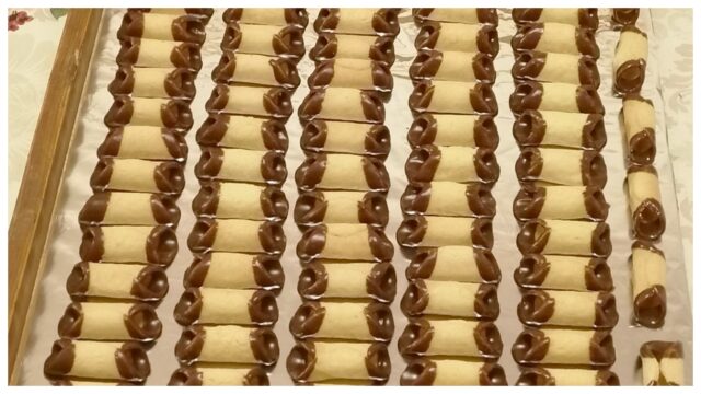 3) Vykrajování a pečení: Těsto vyválíme na tenký plát a vykrajujeme kolečka o průměru 5 cm. Kolečka natáčíme na malé cukrářské trubičky. Pečeme při 175°C přibližně 10 minut.