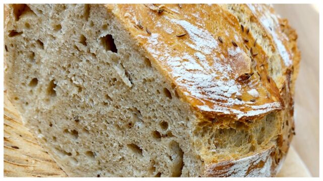 2) Zadělání těsta: K mouce, ve které je zamíchaná sůl a kmín, přidejte kvásek a postupně přilévejte zbytek vody. Těsto jen lehce zadělejte a nechte 12 hodin kynout na teplém místě.