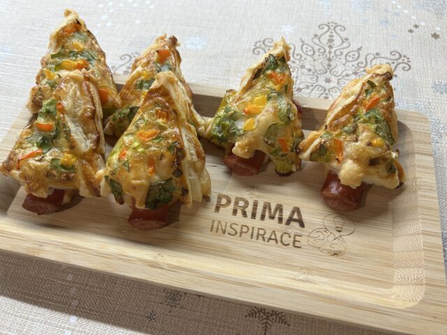 Pečené vánoční stromky z listového těsta s párky, sýrem a zeleninou