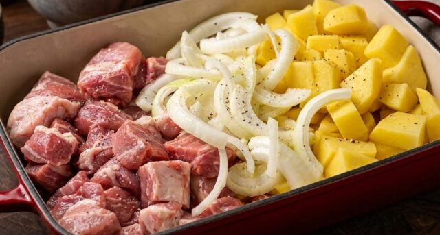 Troubu předehřejte na 180 °C. Vepřovou krkovici očistěte a nakrájejte na středně velké kusy (asi jako na guláš). Brambory oloupejte a nakrájejte na kostky podobné velikosti jako maso, aby se vše propeklo rovnoměrně. Cibuli nakrájejte na silnější půlměsíčky.