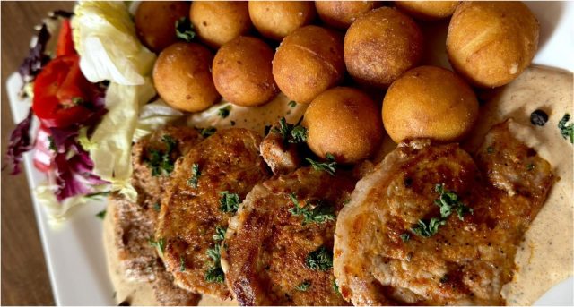 Panenku nakrájím na silnější plátky a podávám s bohatou dávkou omáčky a zlatavými krokety. Ten kontrast měkkého masa, ostrého pepře a křupavé přílohy je prostě návykový.