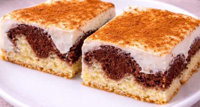 Hledáte dezert, který je vláčný, vysoký a chutná naprosto božsky? Tato buchta s pudinkem a zakysanou smetanou je sázkou na jistotu. Kombinuje v sobě dvoubarevné piškotové těsto, bohatou vrstvu vanilkového pudinku a svěží zakončení v podobě zakysané smetany se skořicí. Díky tomu, že se pudink lije na těsto, se obě vrstvy krásně propojí a vytvoří zajímavou strukturu. Je to ideální moučník na plech, který zasytí i větší návštěvu a zaručeně se po něm jen zapráší.
