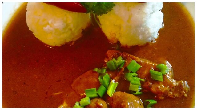 Nejsem si jistý tou dobou 2 hodiny na mírném ohni, někdy mi to vychází rychleji. Ale zahuštění jiškou na závěr chápu—omáčka pak drží a rýže se s tím dobře jí.