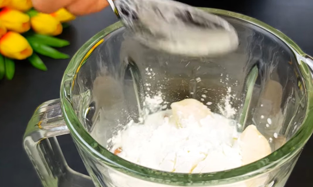 1) Rozmixujeme banány, mléko, mandle a škrob.