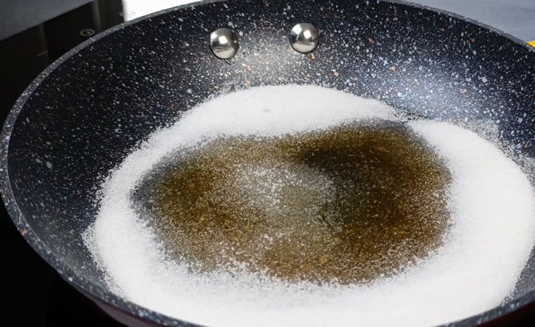 4) Mezitím si na pánvi rozpustíme cukr.