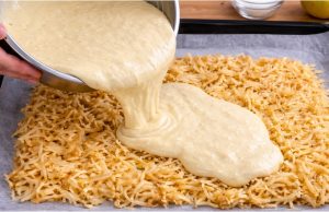 - Nastrouhejte na plech 4 jablka a zalijte těstem: Dokonalý víkendový koláč bez námahy