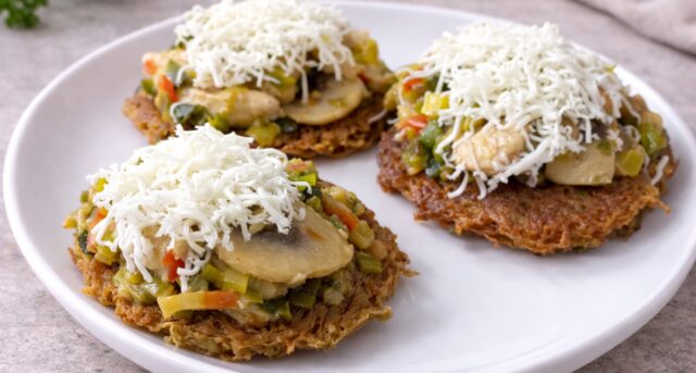 Důležité je masovou směs před nanášením na bramboráčky nechat mírně zredukovat (odpařit přebytečnou šťávu). Také podávejte jídlo hned po vytažení z trouby.