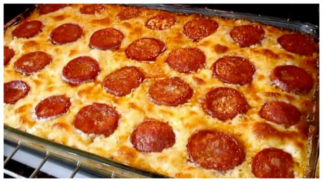 4. Po uplynutí doby pečení vyjměte mísu z trouby, posypejte strouhaným sýrem čedar a naaranžujte kolečka salámu.