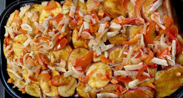 1) Příprava brambor: Brambory nakrájejte na tenká kolečka. Dejte je do mísy, přidejte sůl, mletou papriku, grilovací koření s česnekem a olej. Důkladně promíchejte, aby se brambory rovnoměrně obalily.