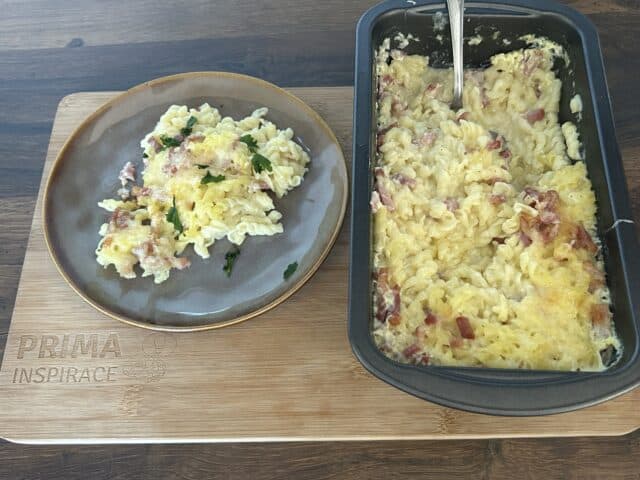 Recept sedí, jen bych zkrátil dobu o pár minut, protože v mojí troubě se to chytá rychleji. Jinak smetana se super spojí a těstoviny jsou krémové i druhý den.