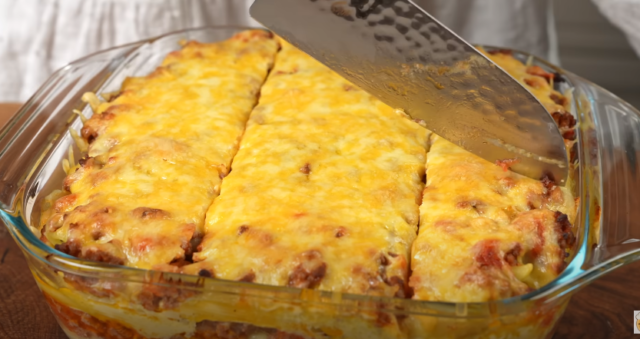 7. Potom 1/2 těstovin s omáčkou rozložte do zapékací mísy a naneste směs mletého masa – postup opakujte ještě jednou a navrch posypejte strouhaným parmazánem, čím více sýra, tým lépe.