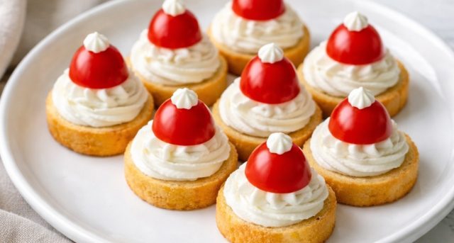 Tyto rozkošné jednohubky s vánoční čepicí jsou ideálním důkazem, že i jednoduchý předkrm může být naprosto okouzlující. Spojení křupavé bagety, jemně vyšlehané fety a šťavnatých cherry rajčat vytváří nejen krásný vizuální efekt, ale také dokonale vyváženou chuť. Krémová konzistence sýra, lehká slanost a svěží rajčatová šťavnatost dohromady působí lehce, přesto slavnostně.