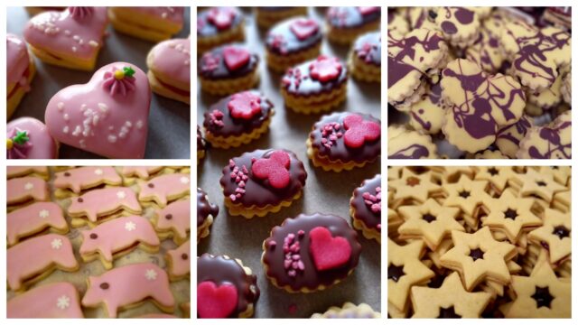 4) Dokončení: Chladné kousky bez otvoru namažte domácí meruňkovou nebo rybízovou marmeládou a přiklopte kouskem s otvorem. Můžete také cukroví zdobit podle své fantazie – pocukrováním, barevnými polevami nebo čokoládou. Pro větší efekt můžete přidat marcipánovou kytičku a posypat barevným cukrem.