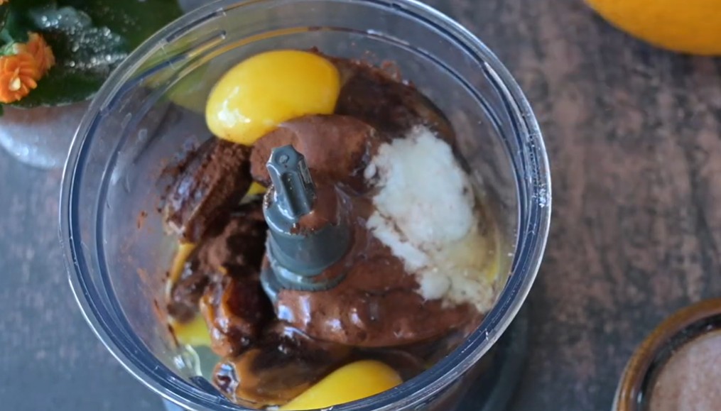 2) Nyní si vyšleháme datle, prášek do pečiva, vejce kakao a sůl.