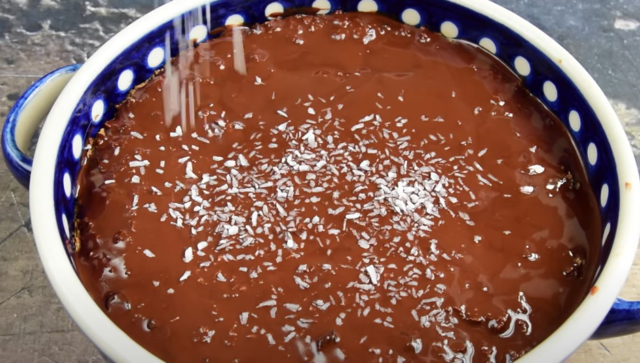 5) Po dopečení zalijeme rozpuštěnou čokoládou a posypeme kokosem.