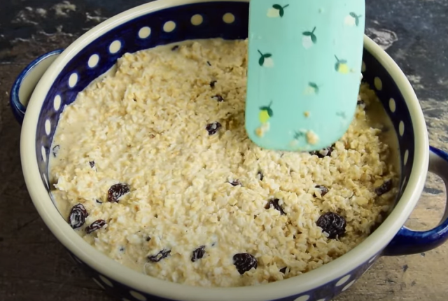 1. Smícháme vločky s mlékem a rozinkami. Necháme 10 minut odstát.