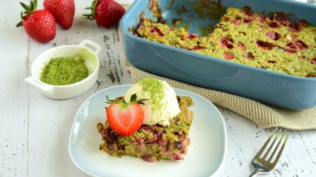Už se vám začínají sbíhat sliny? Pojďme si tedy společně přichystat tento jahodový matcha dort z ovesných vloček!