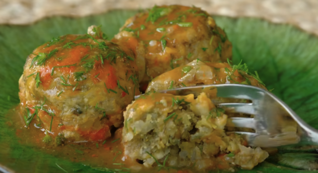 Zeleninové kuličky se zelenou čočkou v rajčatové omáčce s koprem