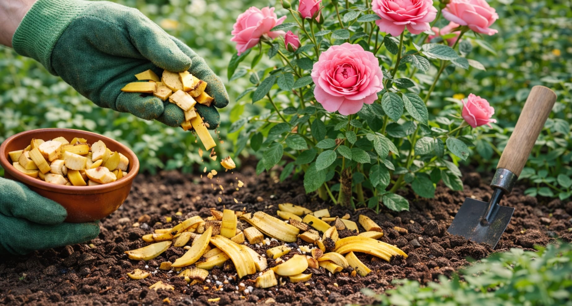 2) Strategické umístění: Při sázení nových rostlin vykopejte jamku o něco hlubší. Na dno dejte banánovou drť a zasypejte ji vrstvou hlíny.
